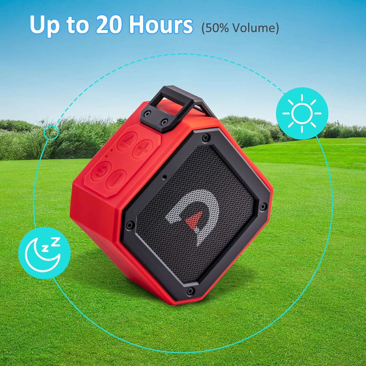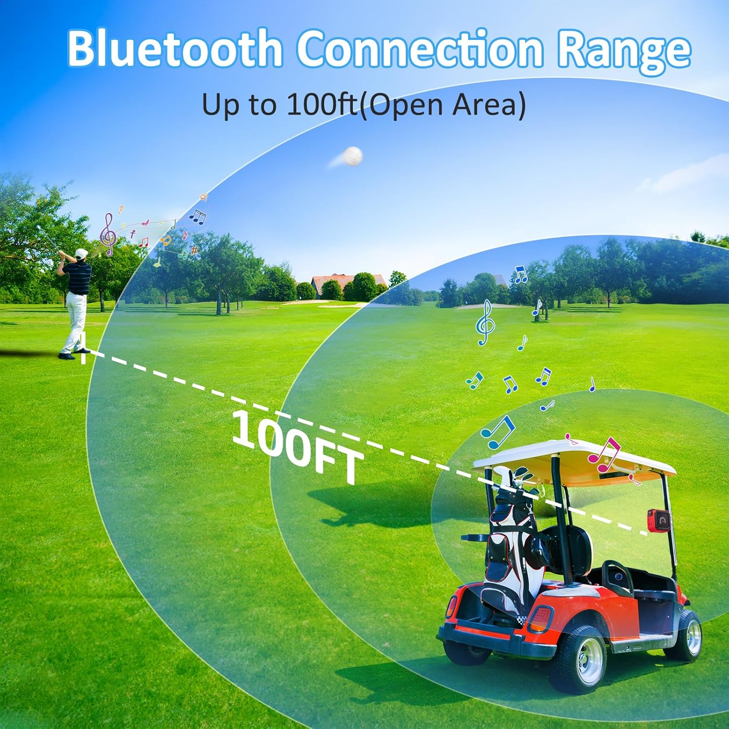 - Extended Bluetooth Range: Up to 100ft(open area) connection range. Synch the golf bluetooth speakers to any phone or other smart device. Play at 50% volume can last 20 hours, and play at 70% volume can last 12 hours.